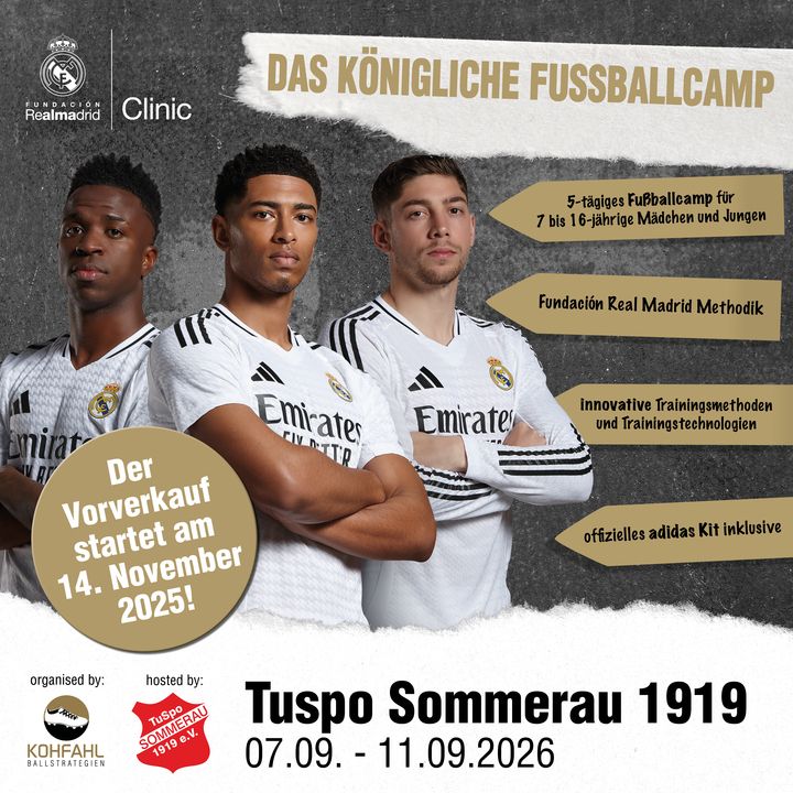 Vom 07.09.25 bis zum 11.09.25 wird die Fundación Real Madrid Clinic, organisiert von Kohfahl Ballstrategien, erneut in Sommerau stattfinden. Das fünftägige „königliche Fußballcamp“ wird auch in diesem Jahr auf dem Vereinsgelände des Tuspo Sommerau 1919 durchgeführt.